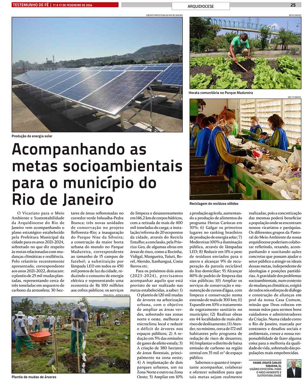 Neste artigo publicado no dia 11 de fevereiro de 2024 no Testemunho de Fé, o Vigário Episcopal para o Meio Ambiente e Sustentabilidade, Padre Josafá Carlos de Siqueira, apresenta os destaques do plano estratégico da Prefeitura do Rio de Janeiro para o período de 2021 a 2024. São ações como o plantio de 25 mil mudas na cidade.