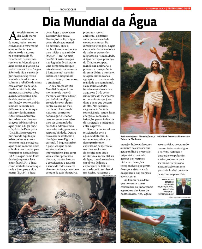 Neste artigo, publicado na edição 1363 do Testemunho de Fé, o Vigário Episcopal para o Meio Ambiente e Sustentabilidade, Pe. Josafá Carlos de Siqueira, celebra o Dia Mundial da Água lembrando a importância da água na perspectiva da fé. O autor lembra que este elemento da natureza carrega a presença do Criador, por exemplo, "para manifestar a calmaria, a pureza e a transparência do amor divino."