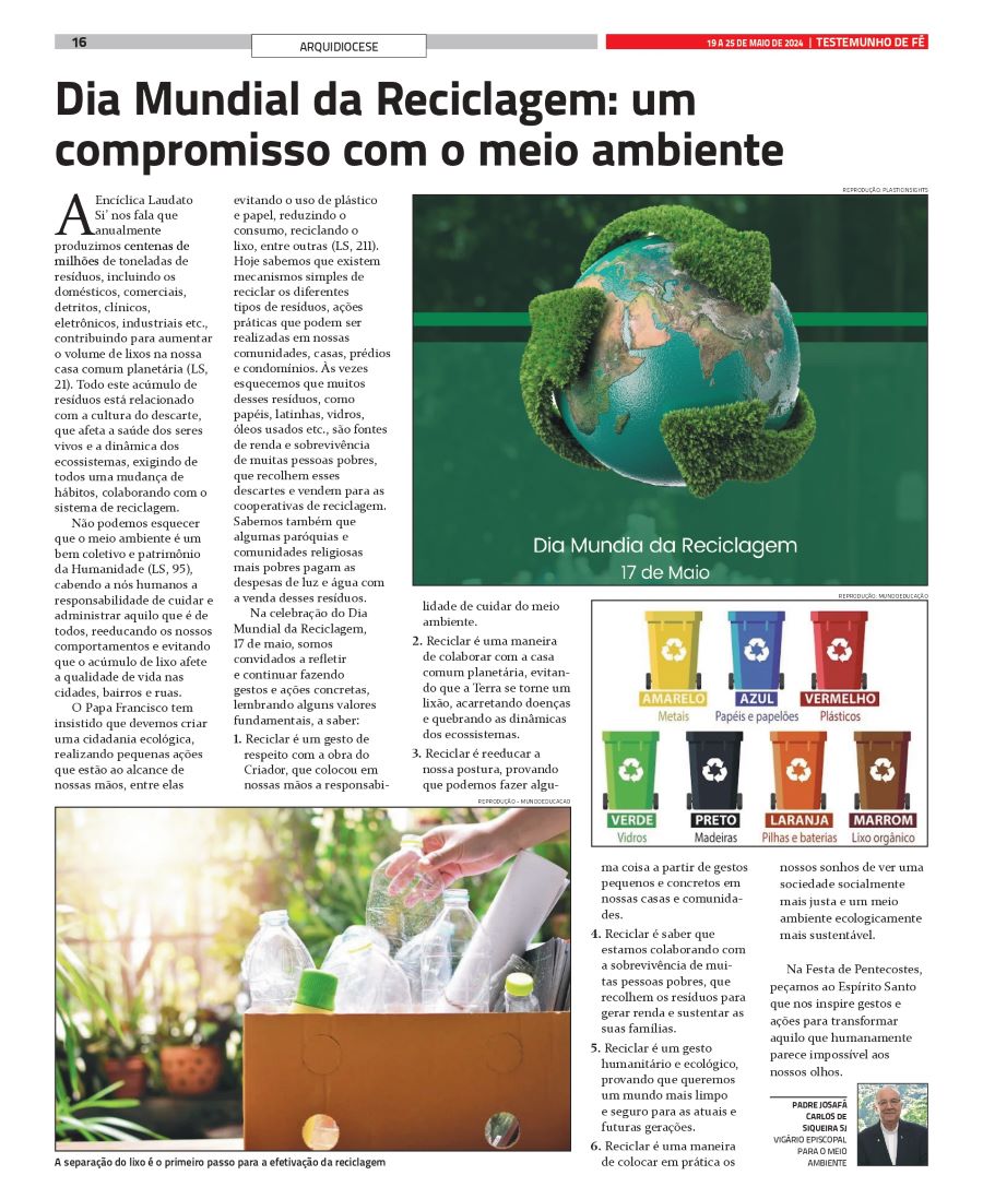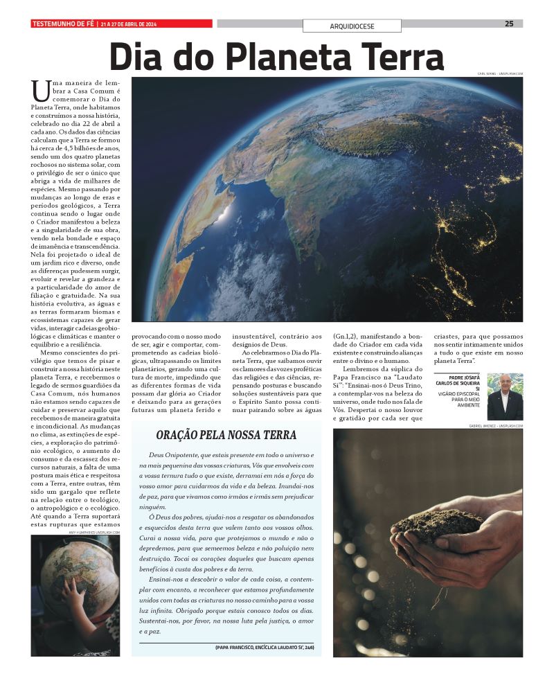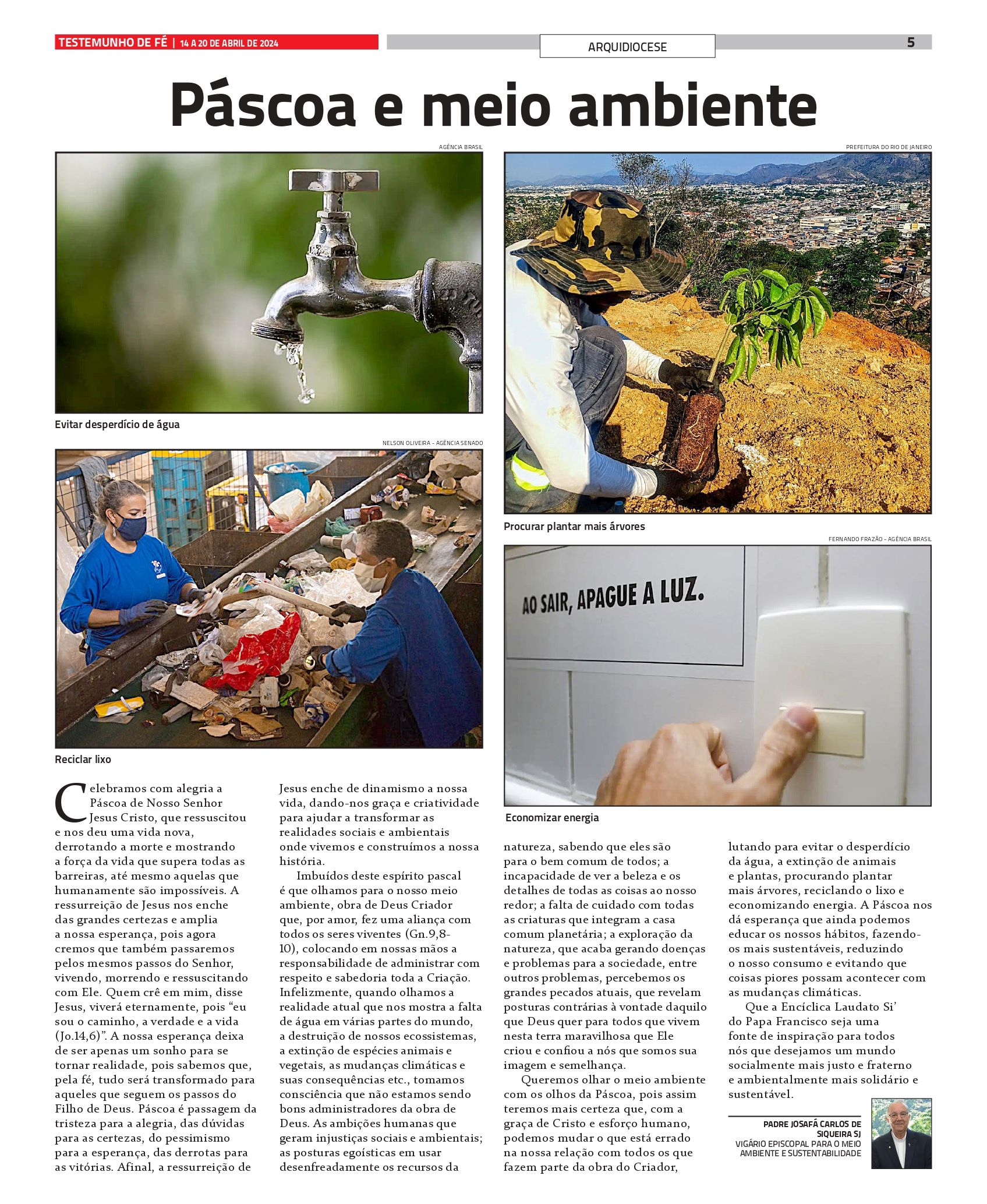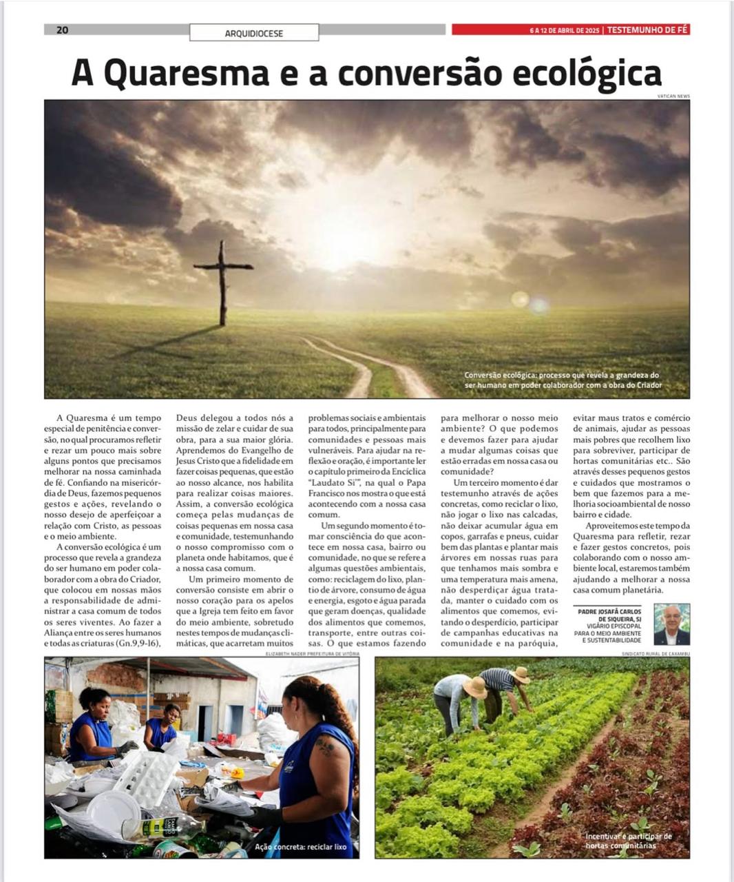 No artigo "Páscoa e meio ambiente", publicado na edição 1367 do jornal Testemunho de Fé, o Vigário Episcopal para o Meio Ambiente e Sustentabilidade, Padre Josafá Carlos de Siqueira, destaca que “a Páscoa nos dá esperança que ainda podemos educar nossos hábitos, fazendo-os mais sustentáveis, reduzindo o nosso consumo e evitando que as cois