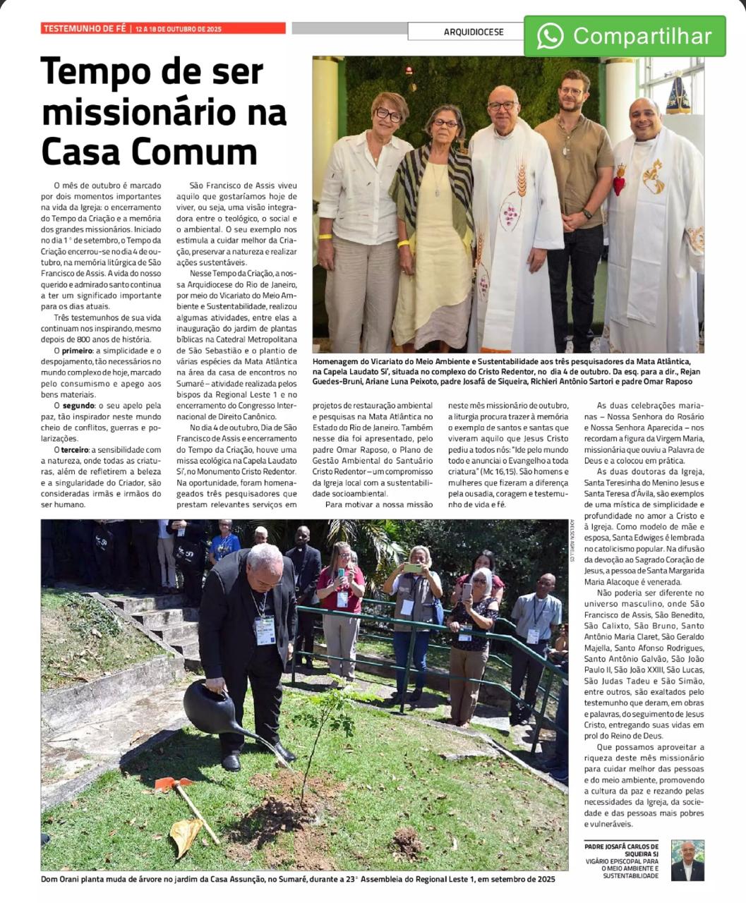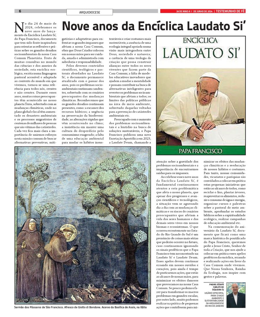 No artigo publicado na edição 1373 do TF, o Vigário Episcopal para o meio ambiente e sustentabilidade, Pe. Josafá Carlos de Siqueira, S.J. , celebra os nove anos da Encíclica Laudato Si’, do Papa Francisco, e destaca o documento como fonte inspiradora para reflexões sobre os desafios socioambientais da nossa Casa Comum Planetária
