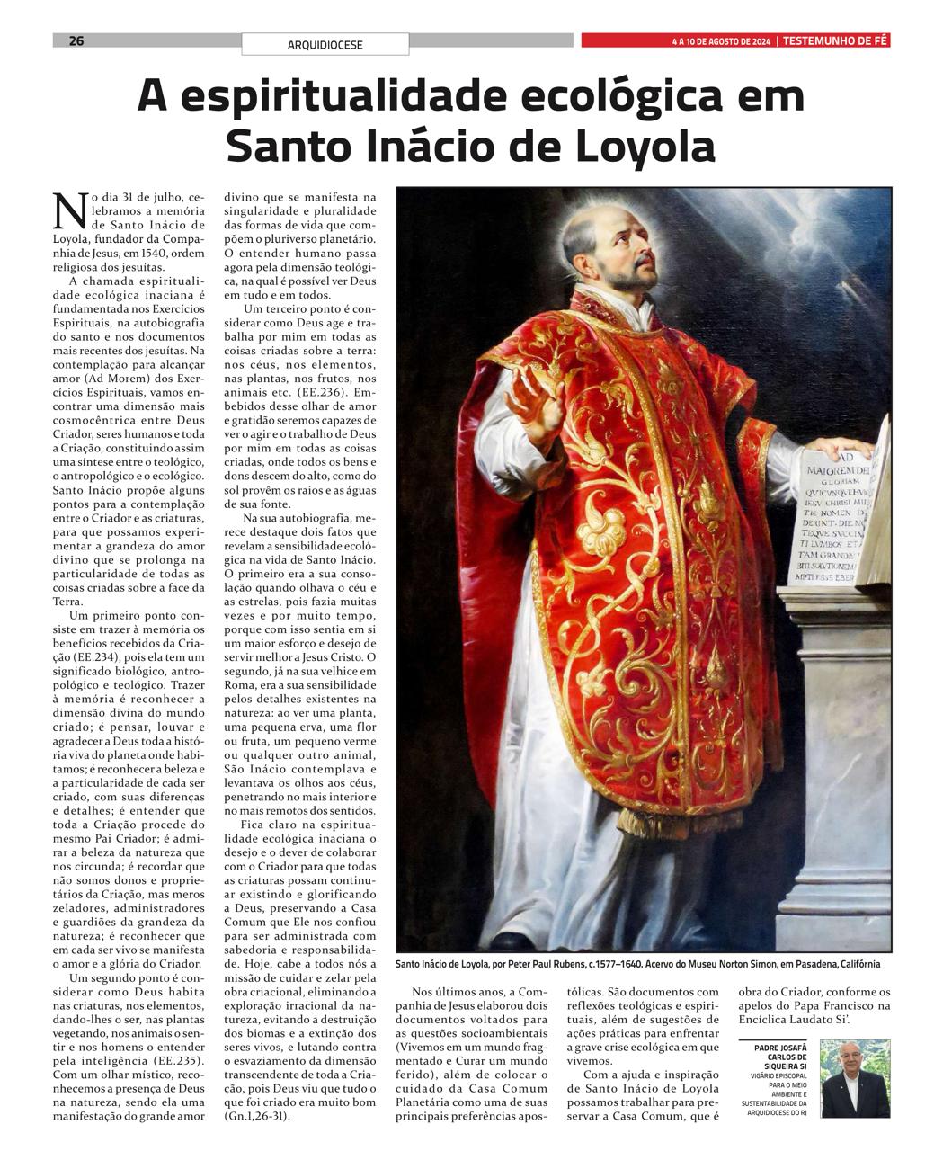 O artigo publicado na edição de 4 de agosto de 2024 do jornal Testemunho de Fé faz uma homenagem à memória de Santo Inácio de Loyola. O vigário episcopal do Vemas, padre Josafá Carlos de Siqueira, S.J., destaca a espiritualidade ecológica inaciana como inspiração para o cuidado com a Casa Comum.