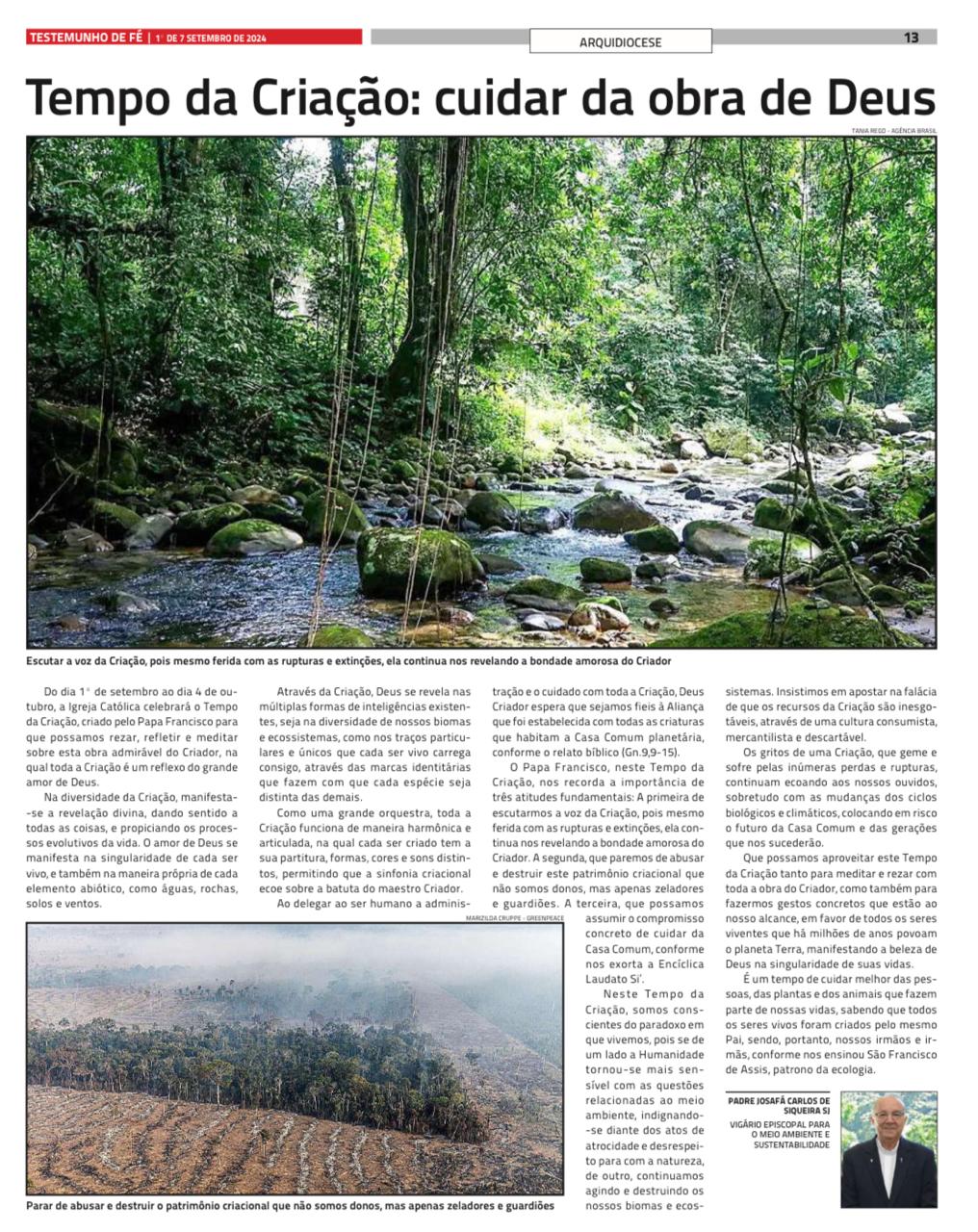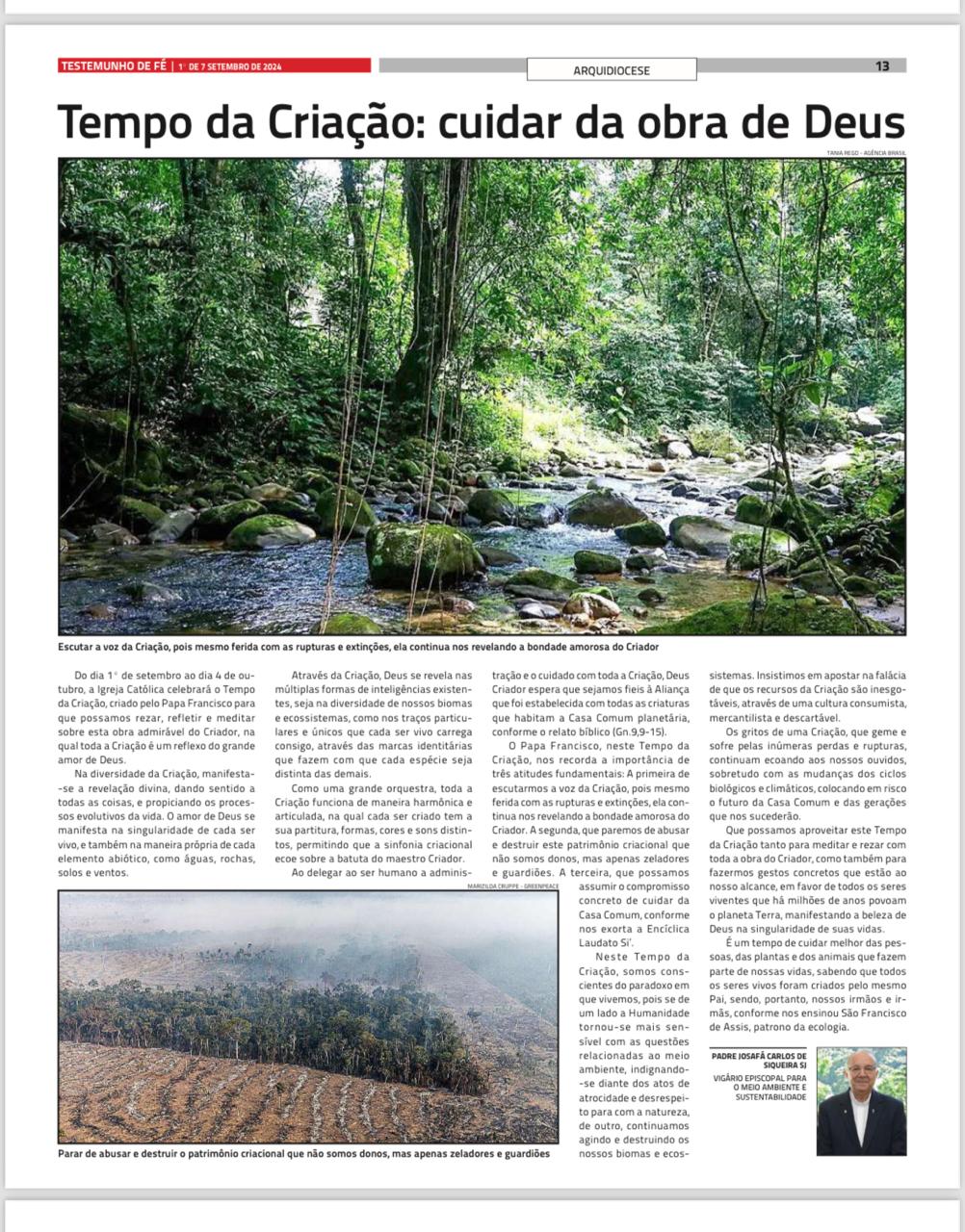 Do dia 1° a 4 de setembro, a Igreja Católica celebra o Tempo da Criação, criado pelo Papa Francisco para que todos nós possamos refletir sobre a grande obra de Deus. Na edição 1.388 do Testemunho de Fé, o vigário episcopal do Vemas, padre Josafá Carlos de Siqueira, S.J., faz uma reflexão sobre a impotância deste momento para cuidarmos melhor das pessoas, das plantas e dos animais.