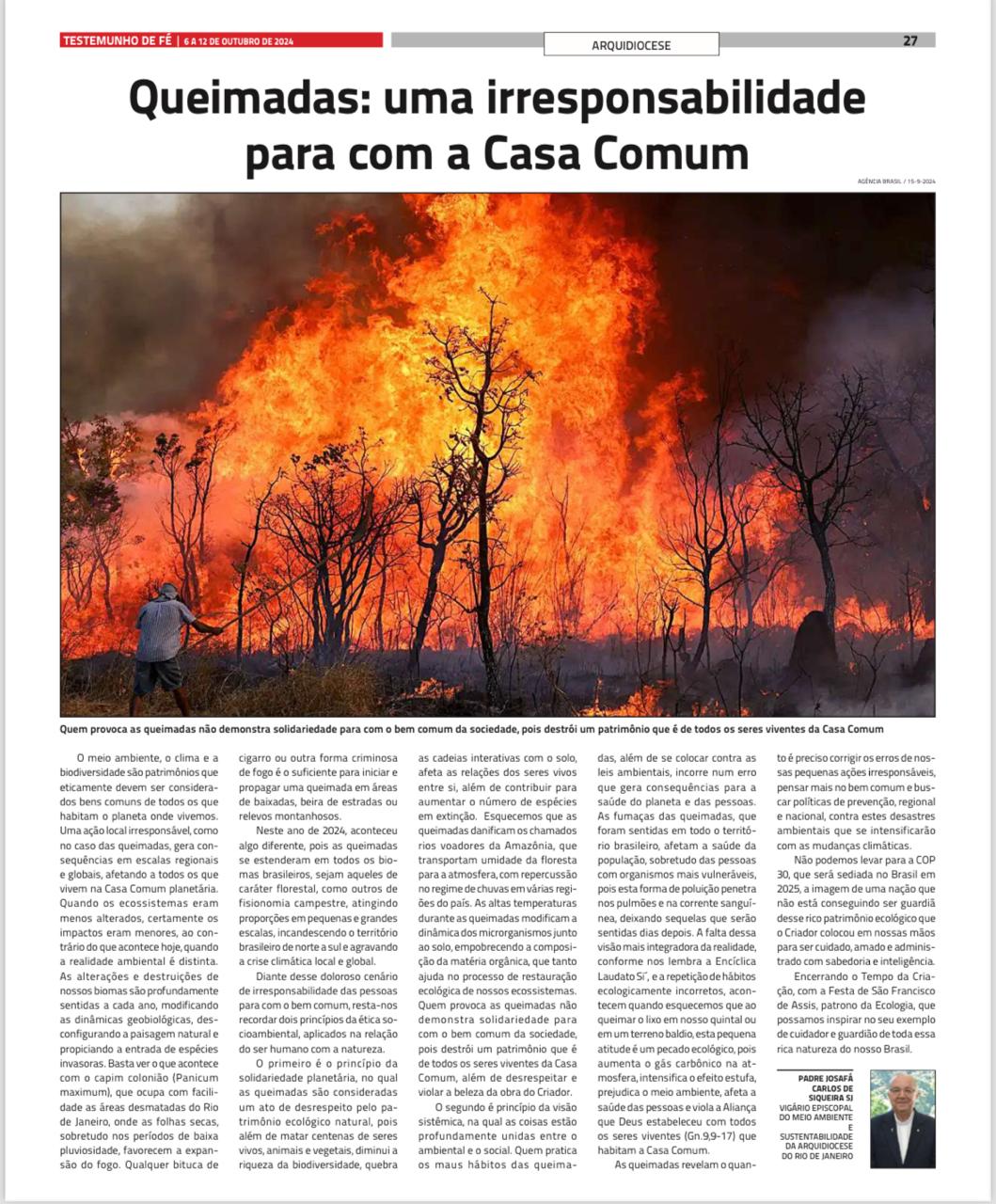 No artigo publicado na edição 1393 do jornal Testemunho de Fé, o vigário episcopal do Vemas, padre Josafá Carlos de Siqueira, S.J., alerta para as queimadas criminosas que ocorrem no país. Ao fim do Tempo da Criação, o autor ressalta a importância de cuidar da Casa Comum com responsabilidade.