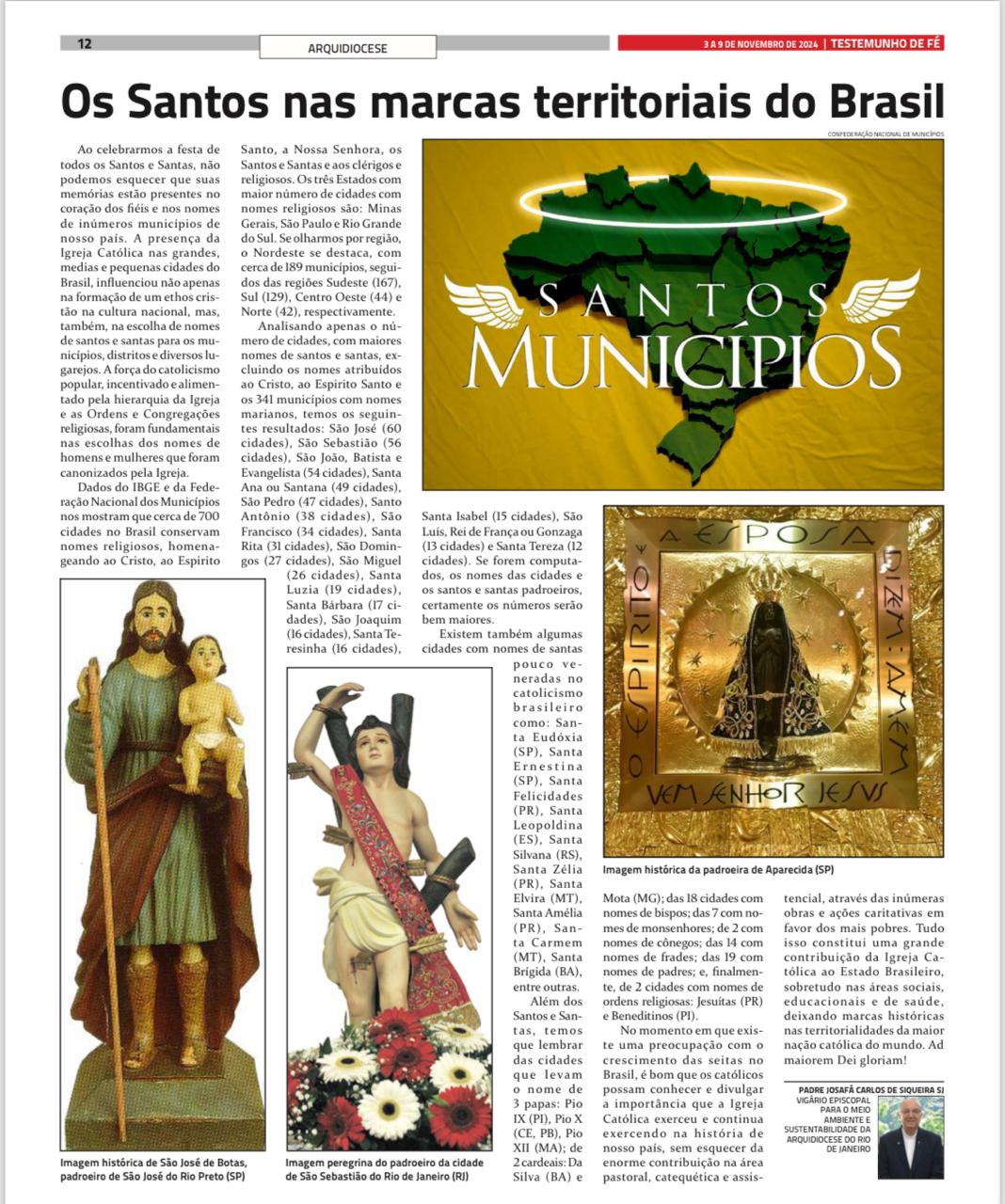 No artigo publicado na edição nº 1398 do jornal Testemunho de Fé, o vigário episcopal do Vemas, Padre Josafá Carlos de Siqueira, S.J., celebra a festa de todos os Santos e Santas. Padre Josafá destaca a marcas da Igreja Católica no país, onde, segundo o IBGE, 700 cidades conservam nomes religiosos em homenagem a Jesus Cristo, Nossa Senhora e diversos Santos e Santos.