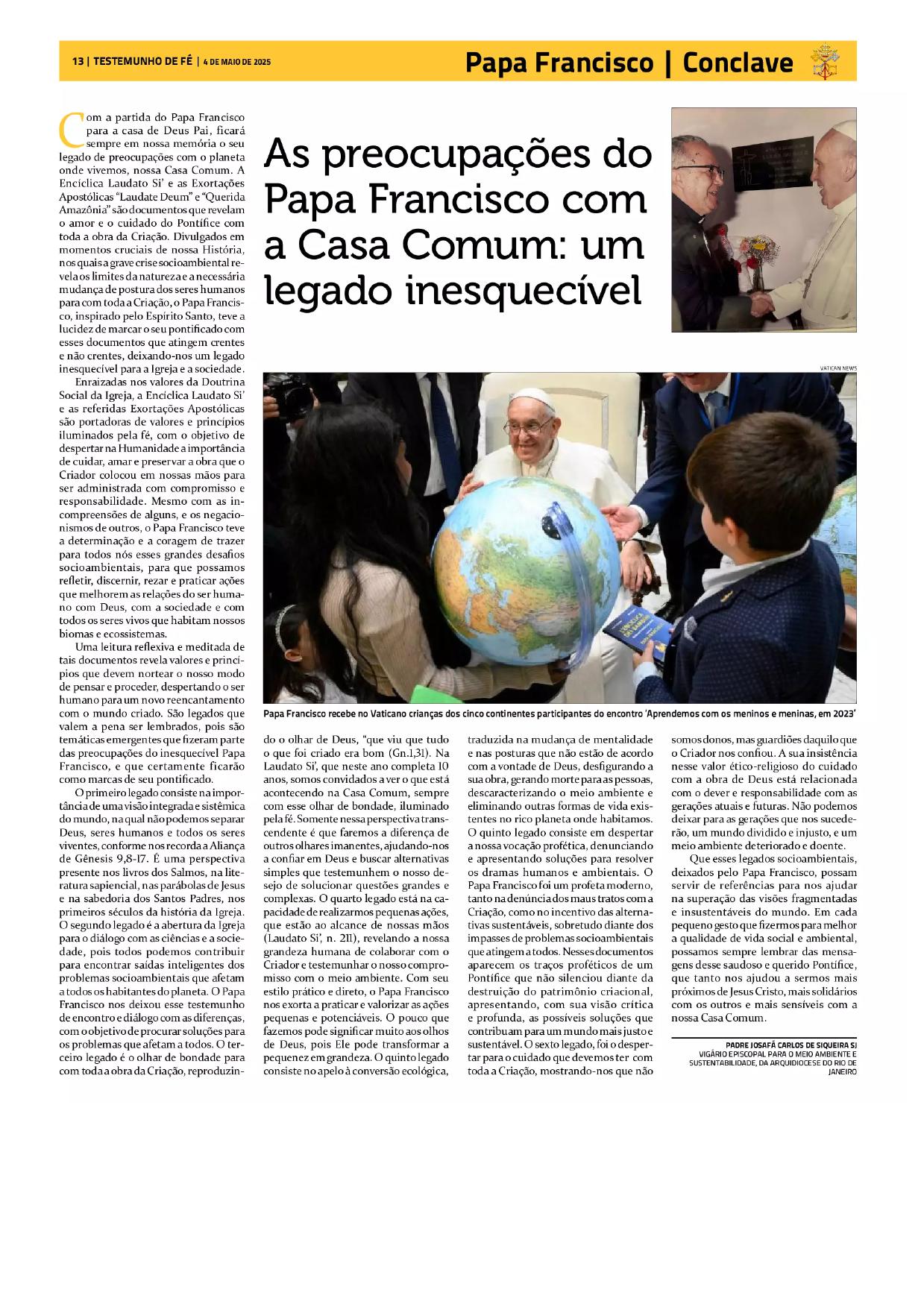 Neste artigo publicado na edição do dia 4 de maio de 2025, o vigário episcopal para o meio ambiente, Pe. Josafá Carlos de Siqueira, S.J., destaca seis legados fundamentais do Papa Francisco para o cuidado da Casa Comum.