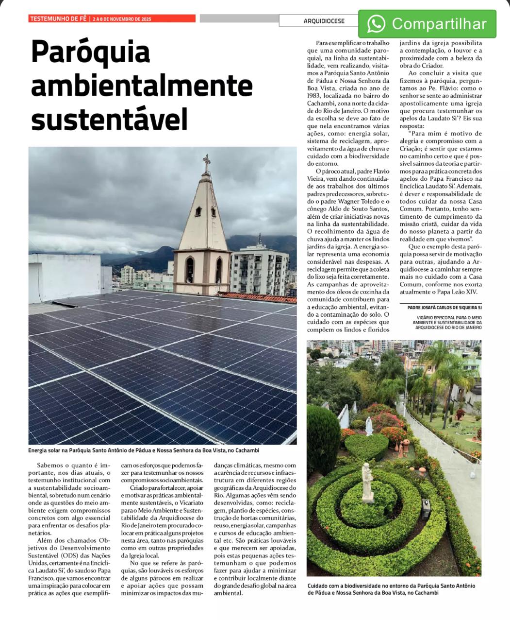 No artigo "Paróquia Ambientalmente Sustentável", Pe. Josafá Carlos de Siqueira, S.J., destaca o trabalho realizado pela Paróquia Santo Antônio de Pádua e Nossa Senhora da Boa Vista, localizada no Bairro de Cachambi, zona norte do Rio de Janeiro. Nela são desenvolvidas ações como: energia solar, sistema de reciclagem, aproveitamento da água de chuva e cuidado com a biodiversidade do entorno.