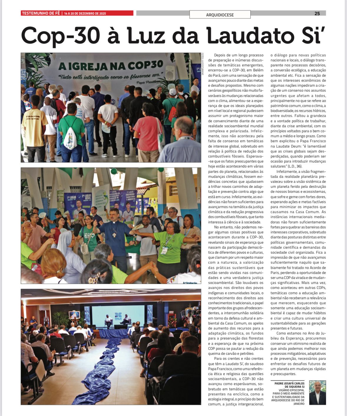 No o artigo “COP-30 à luz da Laudato Si’”, o vigário episcopal do Vemas, Pe. Josafá Carlos de Siqueira, S.J., faz uma reflexão sobre as decisões tomadas no evento que representaram um avanço pequeno no enfrentamento às questões que afetam o planeta.