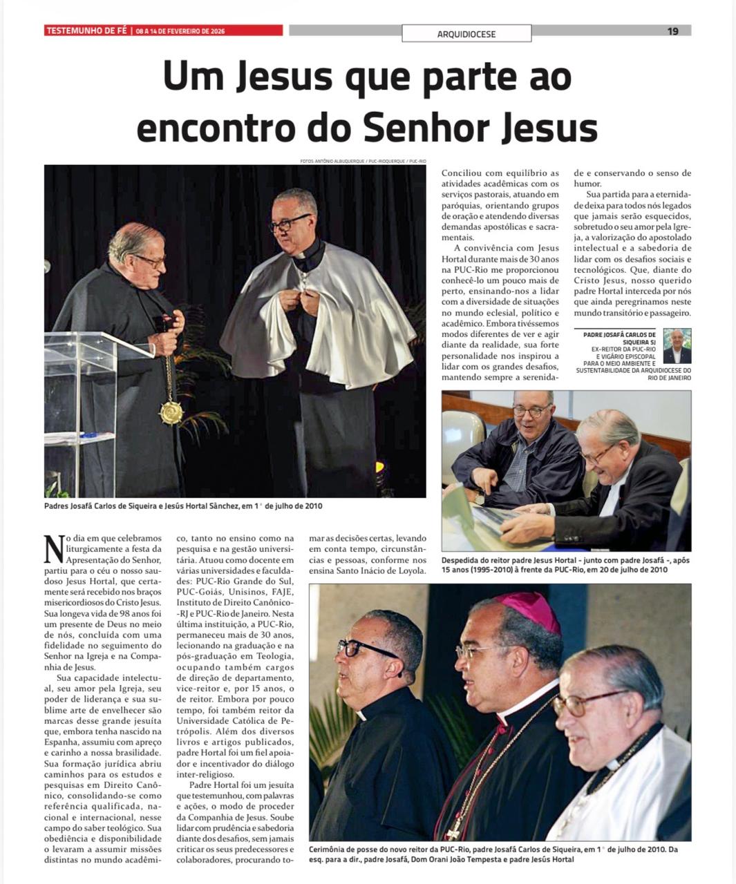No artigo "Um Jesus que parte ao encontro do Senhor Jesus", publicado na edição 1470 do jornal Testemunho de Fé, Pe. Josafá Siqueira, S.J., Vigário Episcopal para o Meio Ambiente e Sustentabilidade, faz uma homenagem a Pe. Jesus Hortal, que faleceu no dia 2 de fevereiro de 2026. Pe. Josafá enaltece o brilhantismo acadêmico e profissional do jesuíta, com quem conviveu por 30 anos na PUC-Rio.