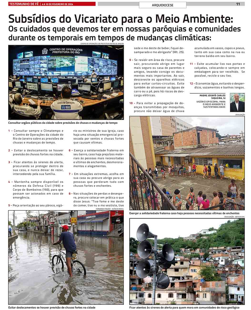 Neste artigo publicado no dia 4 de fevereiro de 2024 no Testemunho de Fé, o Vigário Episcopal para o Meio Ambiente e Sustentabilidade, Padre Josafá Carlos de Siqueira, enumera 13 ações de prevenção e cuidado necessárias em época de temporais.