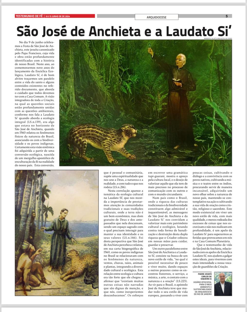 O artigo “São José de Anchieta e a Laudato Si’”, do vigário episcopal do Vemas, pe. Josafá Carlos de Siqueira, S.J., publicado na edição do dia 9 de junho, Dia de São José de Anchieta, destaca os pontos de convergência entre a encíclica e a obra do apóstolo. O jesuíta que chegou ao Brasil com 19 anos, semeou o nome de Cristo no país e tornou-se padroeiro dos catequistas.