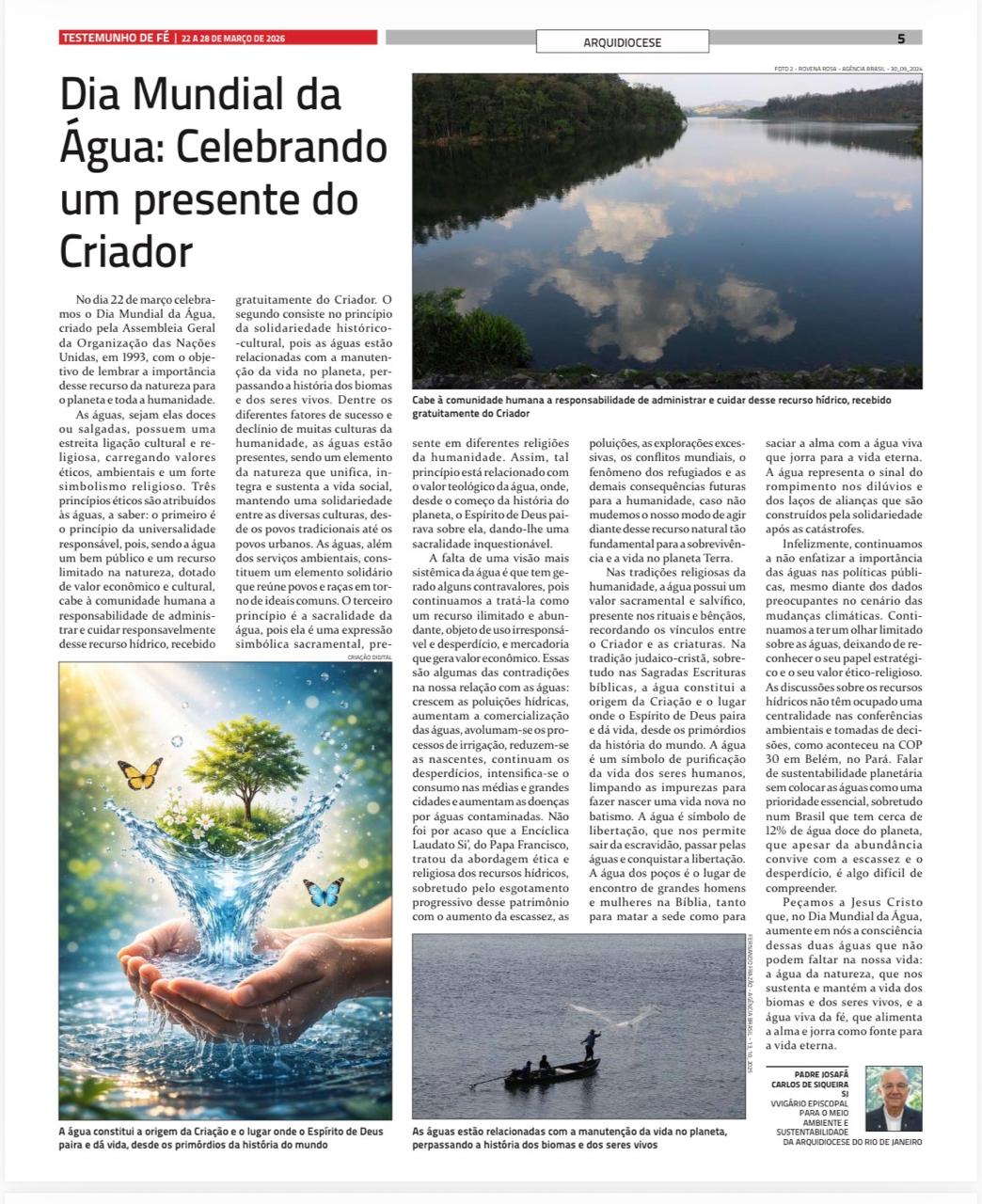 Artigo do vigário episcopal para o meio ambiente e sustentabilidade, Pe. Josafá Carlos de Siqueria, S.J., publicado na edição do dia 22 de março de 2026, Dia Mundial da Água.